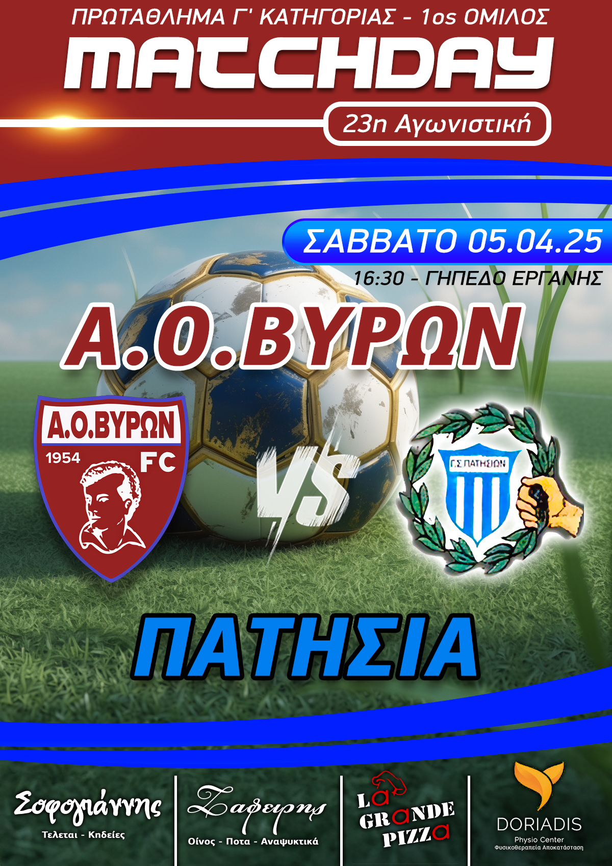 ΑΓΩΝΑΣ ΠΡΩΤΑΘΛΗΜΑΤΟΣ ΑΝΔΡΙΚΟΥ : Α.Ο.ΒΥΡΩΝ - ΠΑΤΗΣΙΑ , ΣΑΒΒΑΤΟ 05/04/2025, ΩΡΑ 16:30, ΓΗΠΕΔΟ ΕΡΓΑΝΗΣ