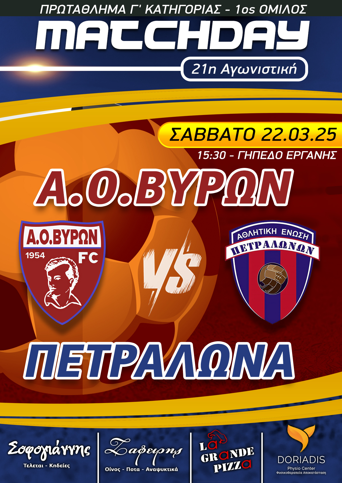 ΑΓΩΝΑΣ ΠΡΩΤΑΘΛΗΜΑΤΟΣ ΑΝΔΡΙΚΟΥ : Α.Ο.ΒΥΡΩΝ - ΠΕΤΡΑΛΩΝΑ, ΣΑΒΒΑΤΟ 22/03/2025, ΩΡΑ 15:30, ΓΗΠΕΔΟ ΕΡΓΑΝΗΣ
