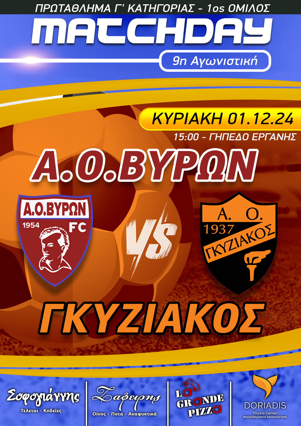 ΕΠΟΜΕΝΗ ΑΓΩΝΙΣΤΙΚΗ : Α.Ο.ΒΥΡΩΝ - ΓΚΥΖΙΑΚΟΣ ΚΥΡΙΑΚΗ 01/12/2024 ΩΡΑ 15:00 ΓΗΠΕΔΟ ΕΡΓΑΝΗΣ